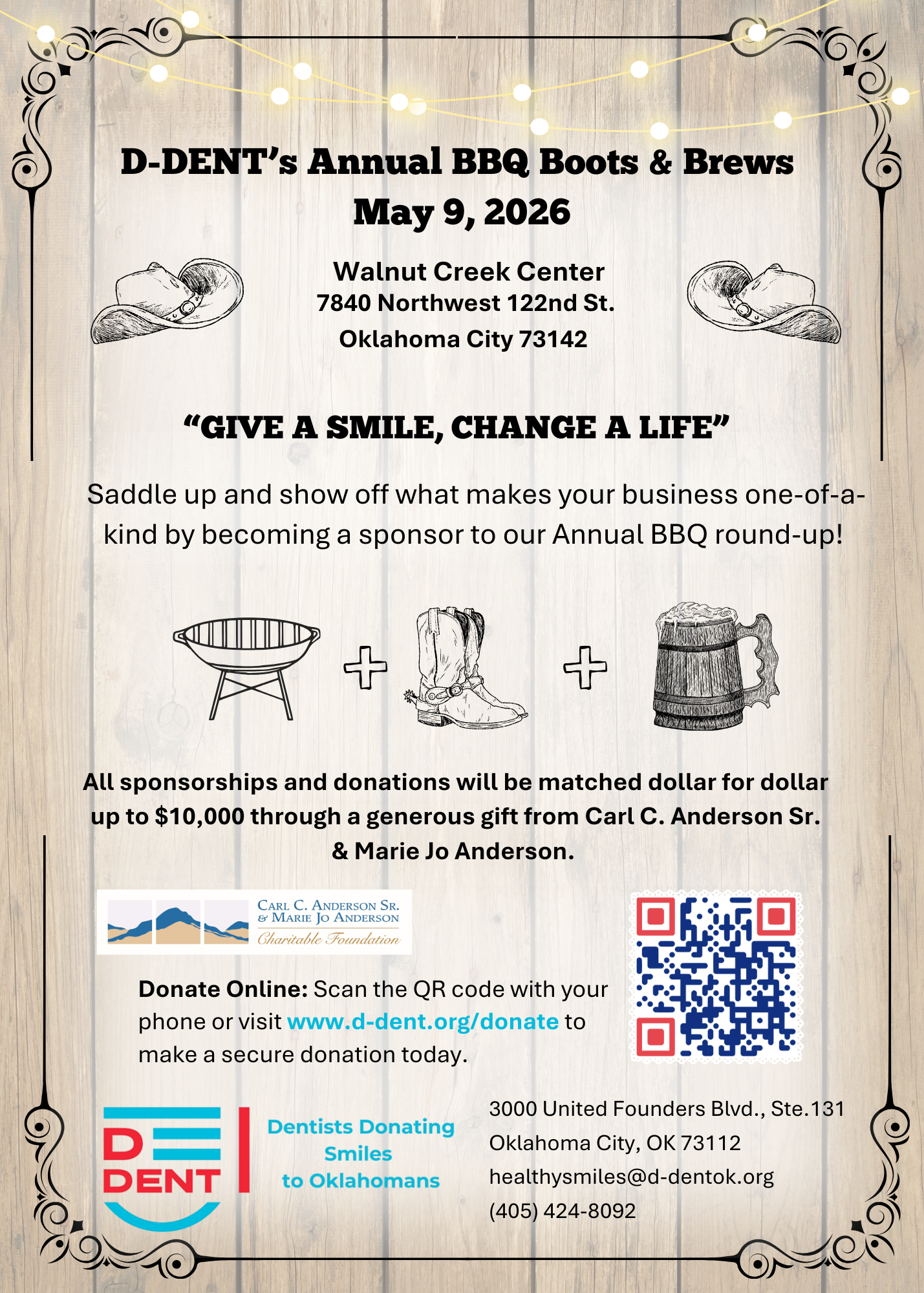 D-DENT's Annual BBQ Boots & Brews Saturday, May 9, 2026 12:00 PM 1:00 PM 12:00 13:00 Walnut Creek Center 7840 Northwest 122nd Street Oklahoma City, OK, 73142 United States (map) Google Calendar ICS View fullsize View fullsize Donate Online
